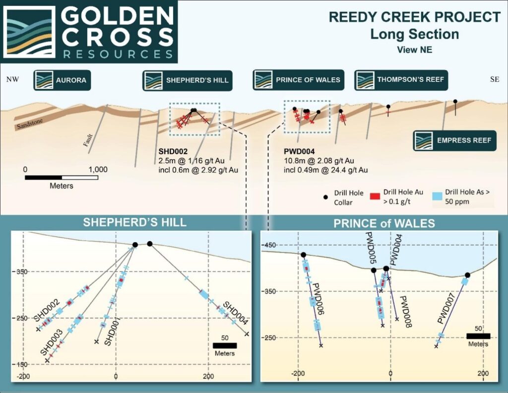 The most recent drilling reported here was completed at Shepherd’s Hill, which is located southeast of, and adjacent to, the highly prospective Aurora Prospect, where drilling is now underway. The first pass drilling at Shepherd’s Hill aimed to test the quartz reef system there and provide structural orientation to future drill programs. Highlights from the Shepherd’s Hill and Prince of Wales drilling include: