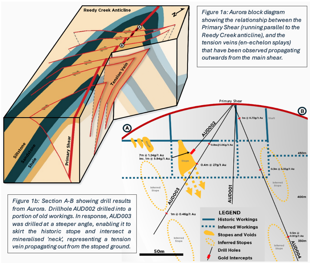 Drilling at Aurora intersected multiple gold-bearing tension veins, which propagate out from a Primary Shear running parallel to the Reedy Creek anticline, consistent with the company’s structural model. Structural Modelling suggests fluid flow within the shear and potential dilation within shear margins and surrounding tension veins. Significant intercepts at Aurora include 0.4m @ 27.0 g/t Au from 80.07m in AUD003 and 0.3m @ 5.35 g/t Au from 84.5m in AUD004, highlighting the presence of high-grade shoots within the broader mineralised system. Notably, mineralised veins are surrounded by strong arsenic halos, further reinforcing correlations with previous drilling.